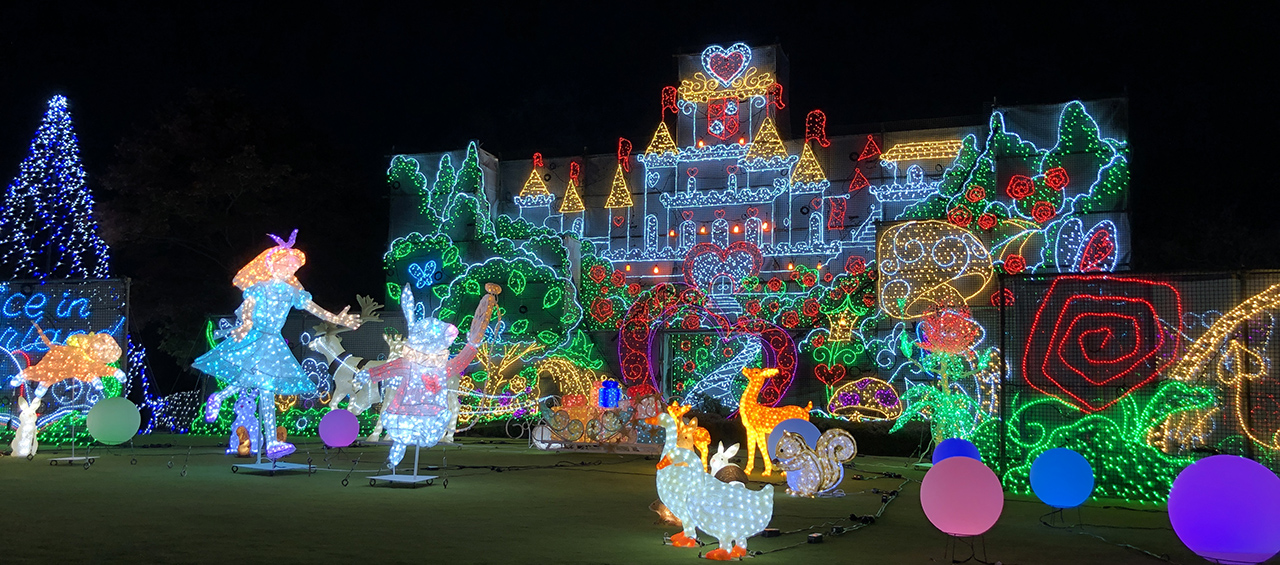 今回は「不思議の国のアリス ~光の波~」がテーマ。アリス第二章「涙の池」のシーンを、45個の球体の光で表現します。国道の中ほどには昨年のキャラクターも登場するなど、今回も見どころ満載です。色鮮やかなイルミネーションは、真冬の暗闇の中でより一層輝きが増して見えます。